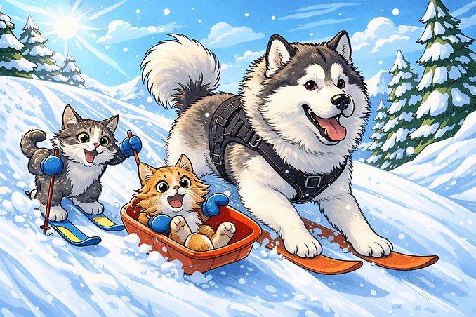 Кот вцепился лапами в шерсть маламута, глаза стали огромными, но… он не спрыгнул.
